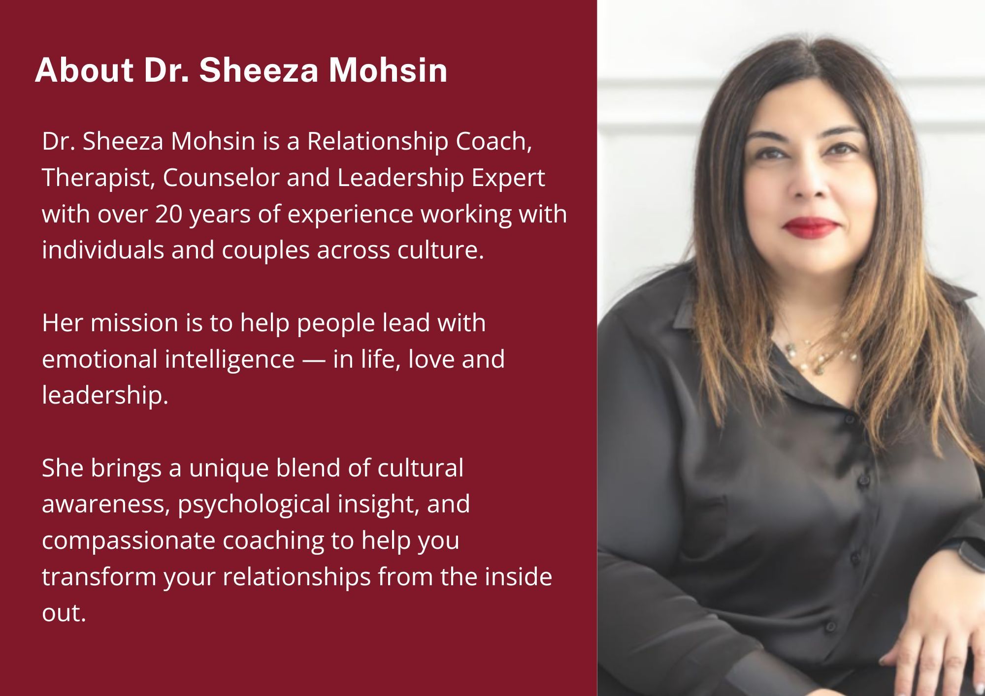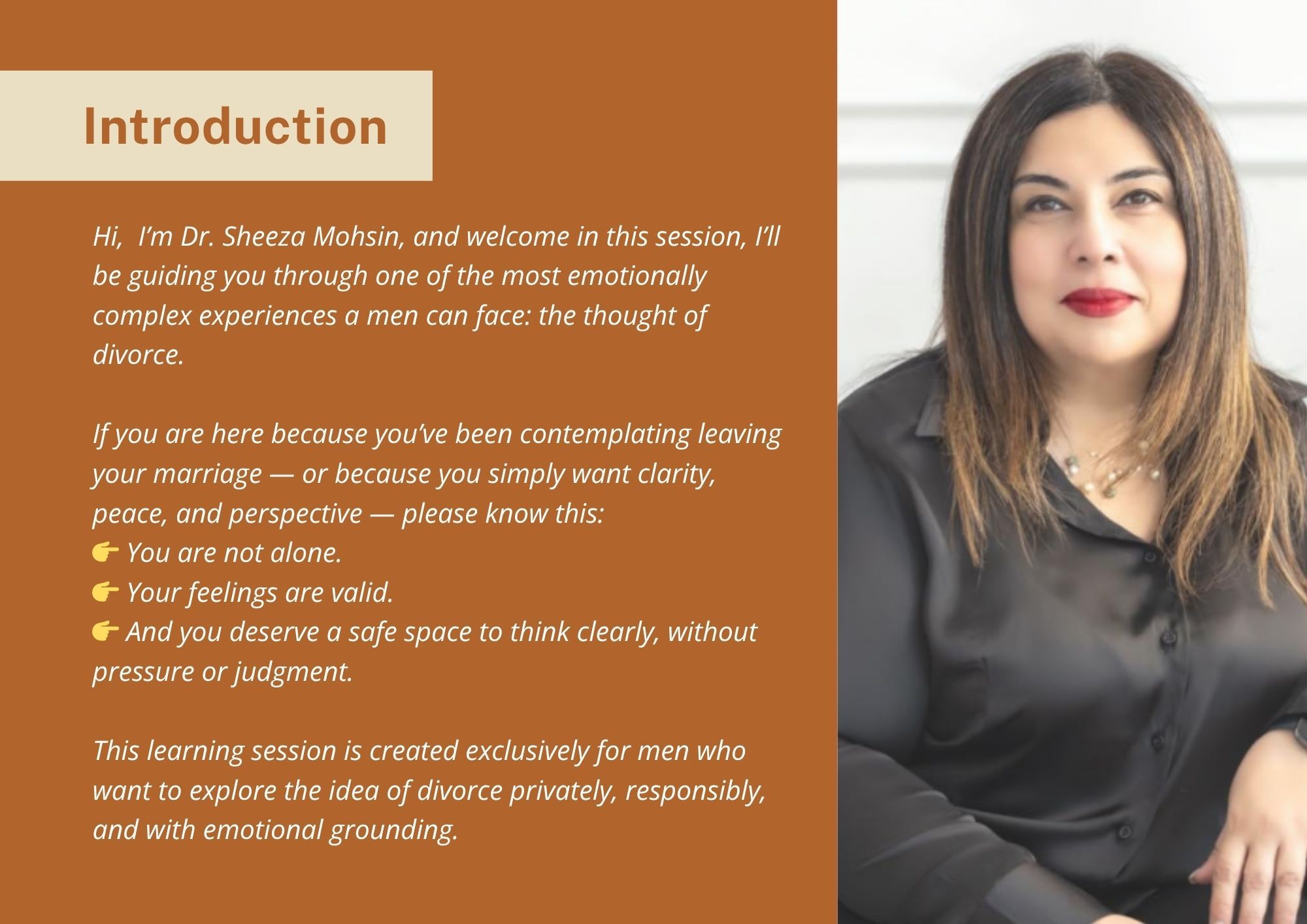 Divorce can be one of the hardest decisions a man can face. This private session is designed specifically for men, acknowledging the cultural pressures, emotional isolation, and relational challenges you may be experiencing. Dr. Sheeza Mohsin will guide you through the emotional, relational, and practical aspects of marriage and divorce, helping you gain clarity and perspective in a safe, confidential space.