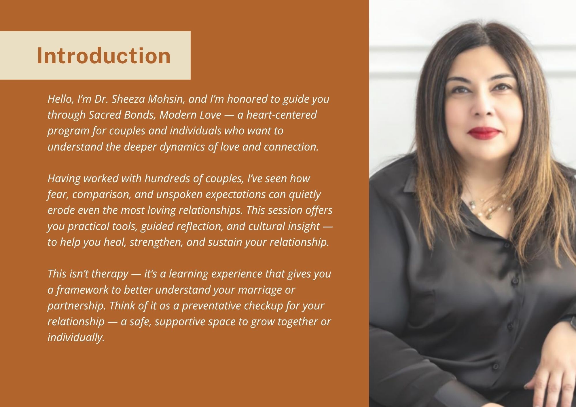 Each topic includes guided reflections, worksheets, and real-life examples drawn from Dr. Sheeza’s experience working with multicultural and Desi couples around the world.